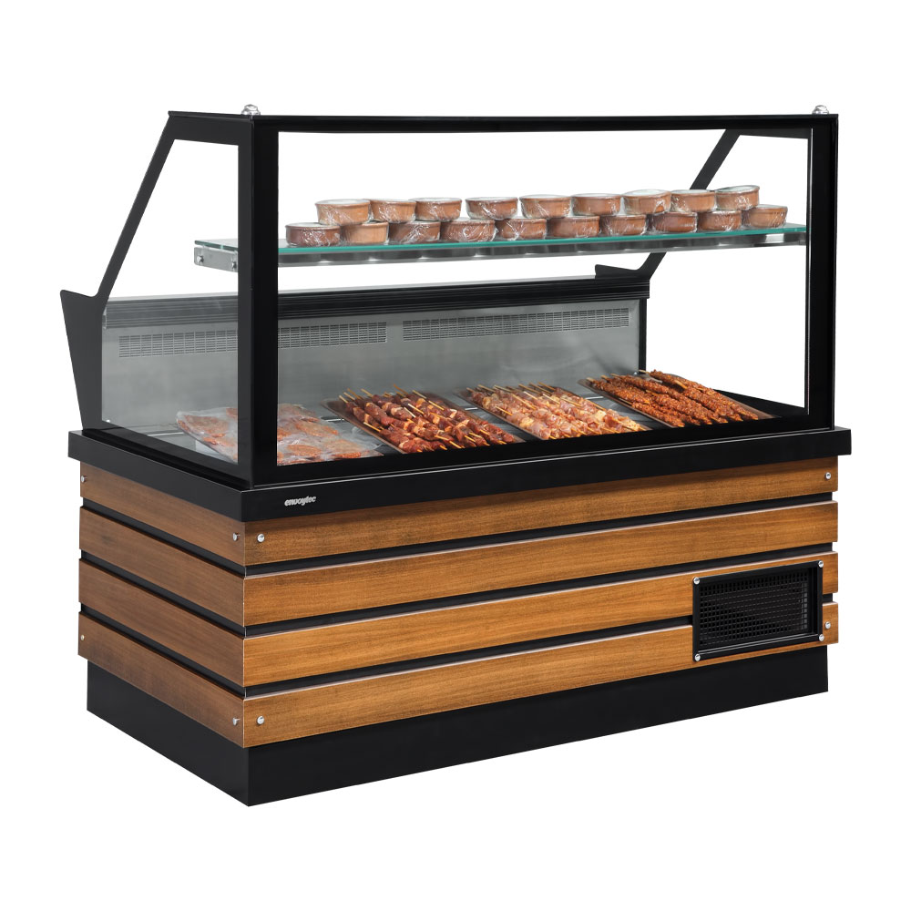 Das Modell PERGAMOS, das für Restaurants und Cafés zur Präsentation von Kuchen, Gerichten, Vorspeisen und Getränken konzipiert ist, ist in gebogenem Glas und in vertikaler Glasversion erhältlich. Es ist ein Modell, das aufgrund seines ästhetischen Aussehens, seiner funktionalen und einfachen Verwendung und seiner verschiedenen Möbeloptionen häufig von Geschäften bevorzugt wird.