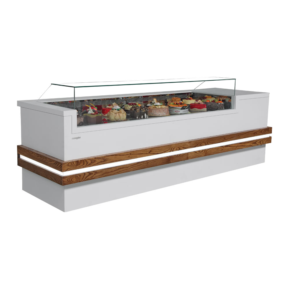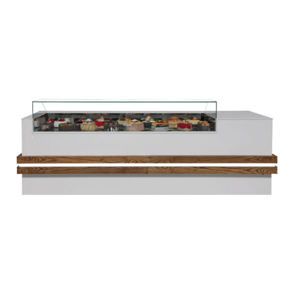 Das ZETHOS-Modell wurde in elitärer Weise für die Präsentation von Produkten wie nassem Kuchen, trockenem Kuchen, Baklava, Gebäck und Schokolade entwickelt. Die Holz- und Natursteinverkleidungen und der beleuchtete Holzteil dieses stilvollen Bereichs verleihen Ihrem Geschäft eine große Eleganz.